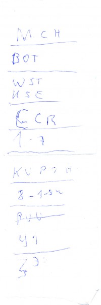 An Schreiben war schon lange nicht mehr zu denken, wobei auch das nicht sonderlich auffiel, da sich Mama ja sowieso unserer Assistenz sicher sein konnte. In den seltenen Fällen, in denen wir sie aufforderten, z.B. den Einkaufszettel zu schreiben, entwischte sie uns, drehte es irgendwie so, dass doch wieder wir schrieben. Ich kann mich nicht entsinnen, meine Mutter nach dem Tod meines Vaters jemals beim Schreiben gesehen zu haben. Als ich nach ihrem Tod die Unterlagen zum Grab meiner 1994 verstorbenen Großmutter sichtete, sah ich, dass sie 2004 noch mit Mühe auf der Rechnung der Friedhofsgärtnerin „B E Z A H L T“ notiert hatte, datiert allerdings auf ein Datum im Jahr 3004. Bereits im Folgejahr hatte sich die Notiz in „B Z H T“ ohne Datum verändert. Schon im Herbst 2006 war ich sehr überrascht gewesen, als ich mit ihr auf ihrer Bettkante saß und mir den Inhalt ihres Nachttischs zeigen ließ, der in gewisser Weise zum Inhalt ihres Lebens geworden war. Zwischen verschiedenen Portemonnaies, dem Schmuckkasten und einigen Bildern lagen zwei Abrisse der Einkaufszettel-Rolle, die sie mir mit den Worten „Das braucht man auch nicht mehr“ in die Hand drückte. Darauf Schreibversuche von Mama. Von wann, weiß ich nicht. Während “Wurst” und “Käse” ebenso wie “Funkuhr” mit etwas Phantasie noch wieder zu erkennen sind, hatten einige der Wortgebilde wohl nur in Mamas Realität einen Sinn.